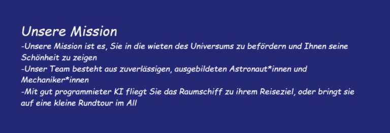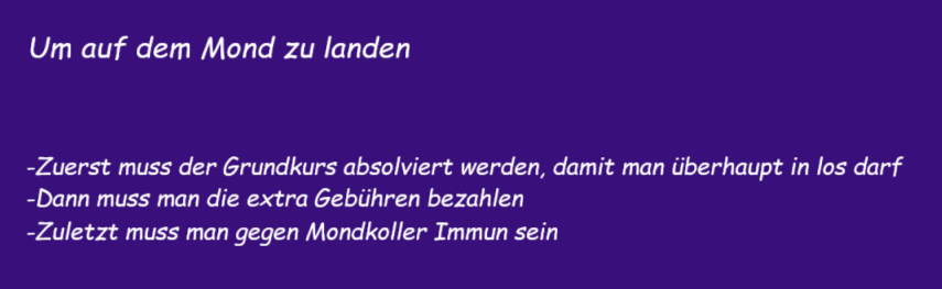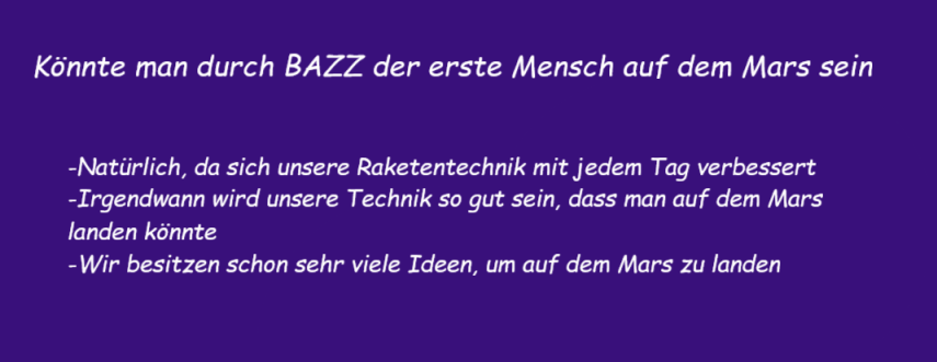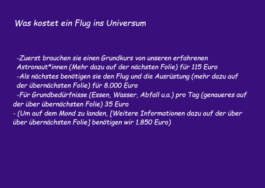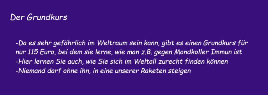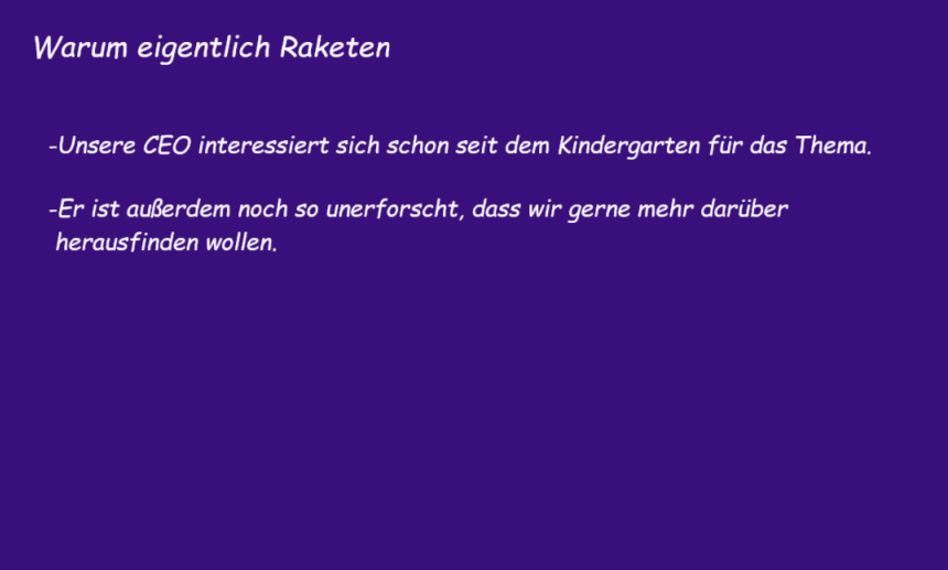 An meiner Schule gibt es, wie bei vielen anderen Schulen auch, eine Projektwoche. Ich bin glücklicherweise mit meinen besten Freunden in einem Projekt, obwohl sich eine ihren Fuß verstauchte und deswegen die ganze Woche gefehlt hat, aber dass stellte kein großes Problem dar. Wir drei, hatten das Projekt ,,Eine eigene Firma gründen gewählt. Ich kam dann auf die grandiose Idee, eine Raketen-bauende Firma zu kreiren. Dass taten wir dann auch. Anstatt alles auf ein Plakat zu schreiben, wie jeder andere, machte ich eine Powerpoint Präsentation. Es ist zwar ein wenig Peinlich, aber ja.